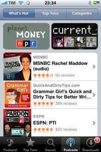 Mas a minha função preferida foi poder baixar os podcasts direto no aparelho. Além dos que já temos a assinatura, é possível navegar por uma nova área no iTunes móvel como mostra a imagem abaixo.